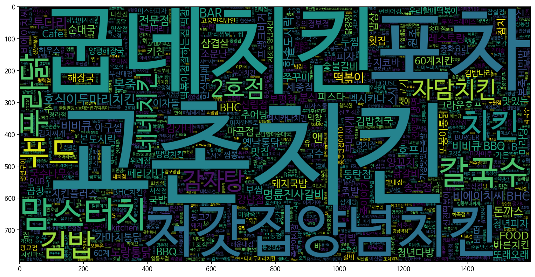 마지막으로 일반음식점 상호명을 가지고 '워드클라우드'를 만들어 보겠습니다. 워드클라우드는 단어 리스트를 가지고 반복되는 빈도에 따라 글자크리를 다르게 하여 시각화 하는 것입니다.