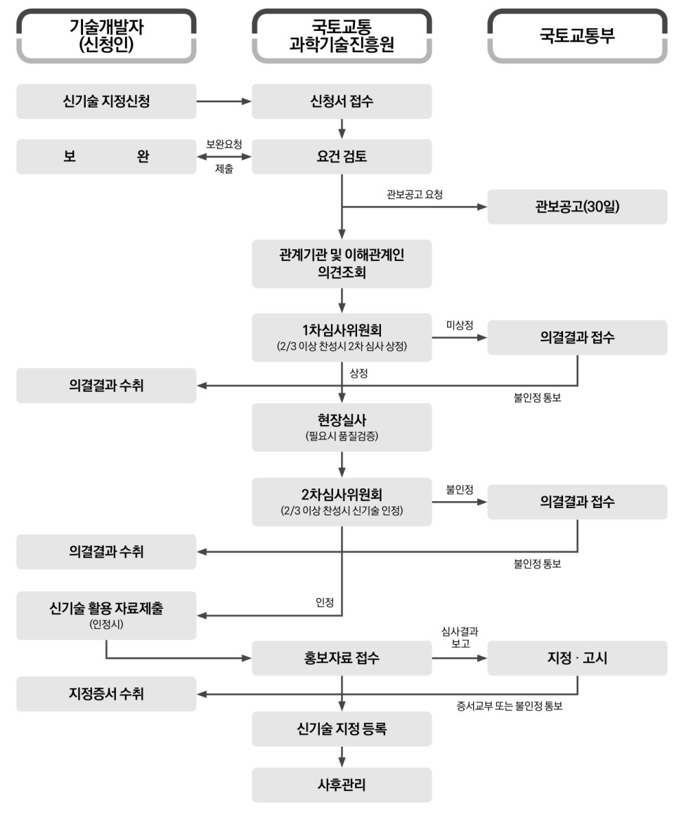 신청서 접수(요건검토 Step1~Step5)/국토교통과학시술진흥원) > 관보공고(이해관계인 의견청취/국토교통부) 및 관계기관 의견조회 > 1차심사(신규성, 진보성, 경제성) > 현장실사(품질검사) > 2차심사(현장적용성, 보급성) > 지정·고시 및 지정증서 발급 > 사후관리(자료보관 및 활용)