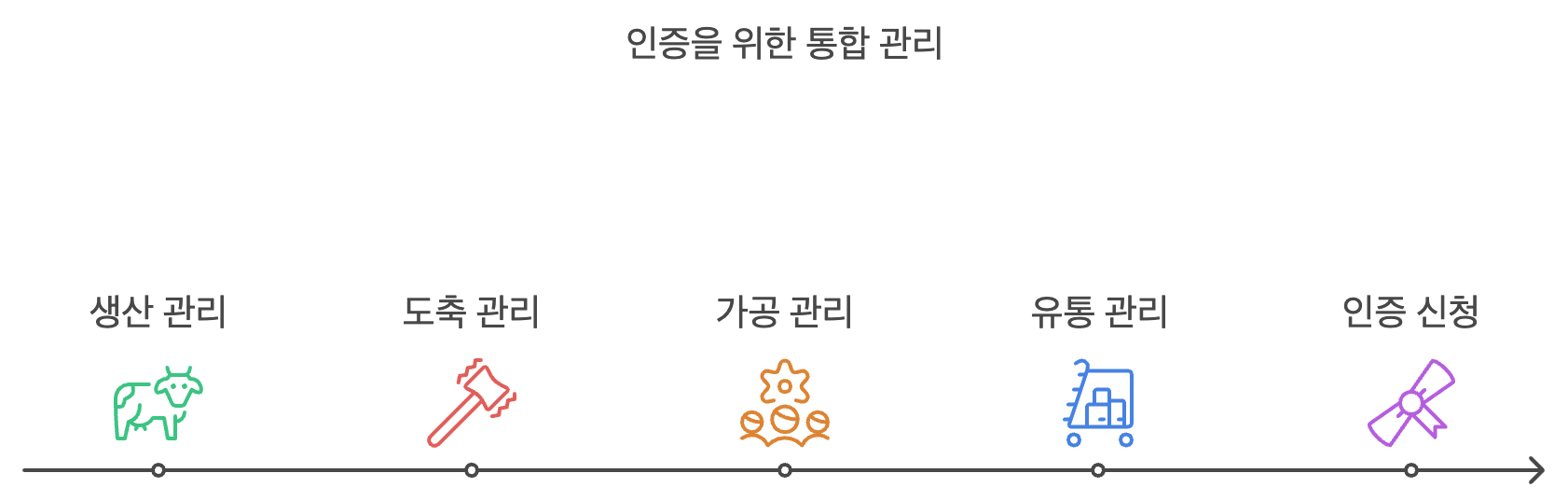 이 조항에서 가장 중요한 요소는 통합 관리입니다. 축산물의 생산, 도축, 가공, 유통까지 모든 단계를 직접적으로 관리하거나 협력 시스템을 통해 일관된 품질과 안전성을 유지할 수 있어야 합니다. 단순히 한 부분만 잘 관리하는 것이 아니라, 모든 단계가 유기적으로 연결되어 품질 관리가 이뤄져야 인증 신청 자격을 얻게 됩니다.