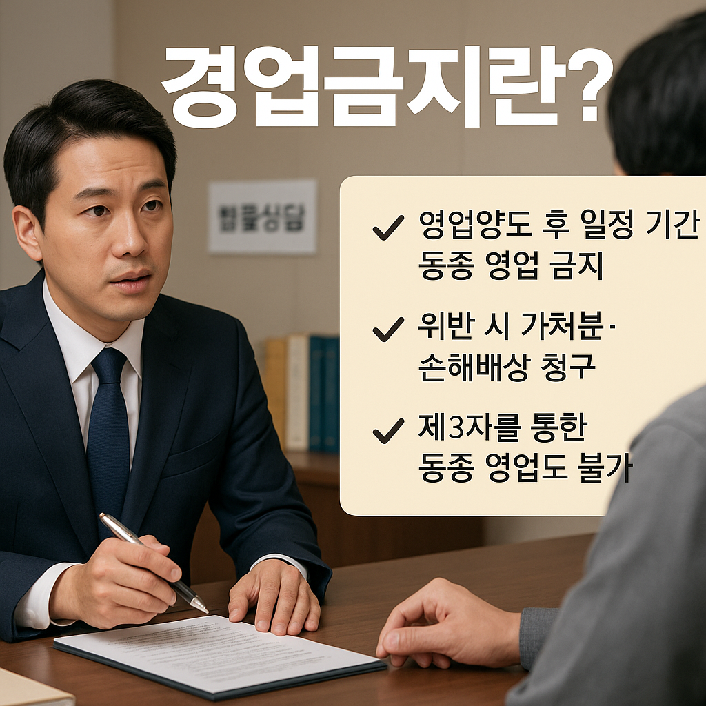 - 영업양도 계약서 작성 시에는 반드시 ‘경업금지 조항’을 명시적으로 삽입해야 합니다.