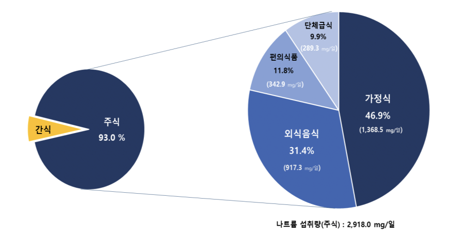 특히 30~40대 남성이 하루 평균 **3,389mg(소금 약 8.5g)**를 섭취하며 가장 높은 수치를 기록했습니다.