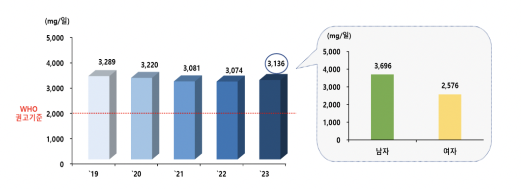 2023년 기준 하루 평균 나트륨 섭취량은 3,136mg입니다. 이는 2011년 4,789mg에서 무려 34.5% 감소한 수치입니다. 분명 긍정적인 변화입니다.