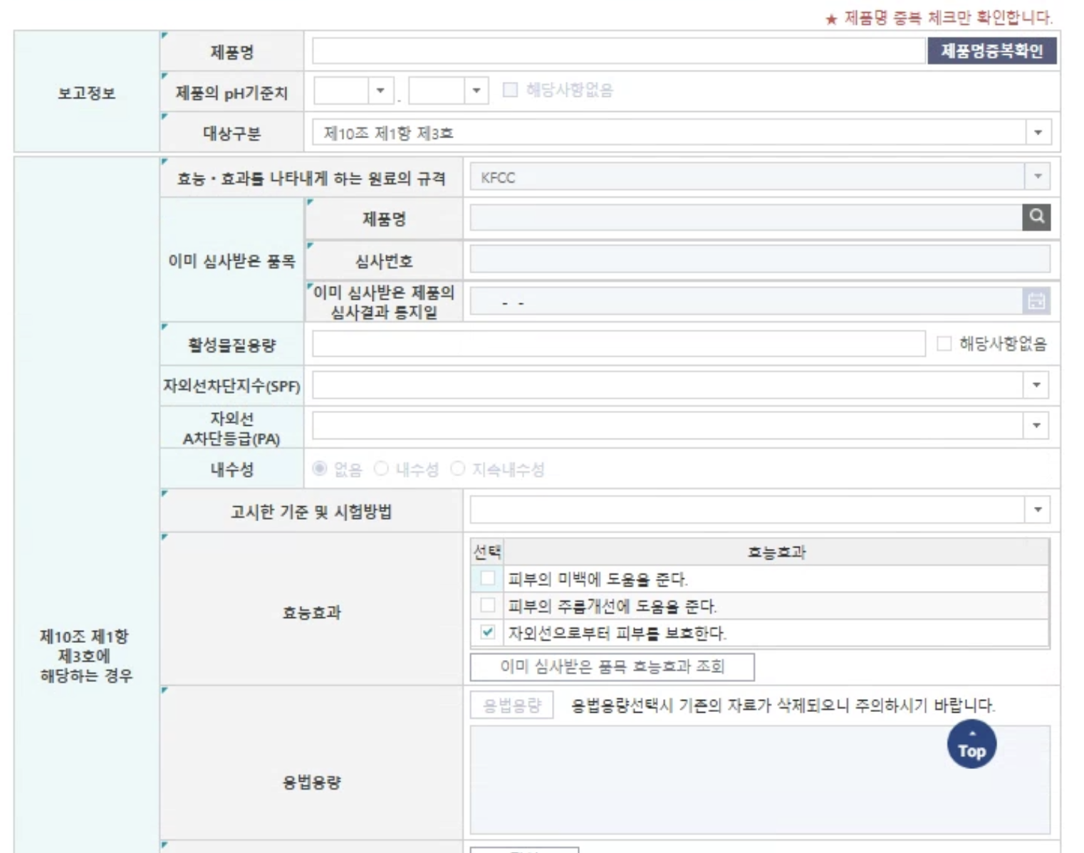 - 미백, 주름 개선 기능의 경우 식약처 고시 기준에 따라 작성해야 하며, 효능과 안전성에 대한 근거를 명확히 기재해야 합니다.