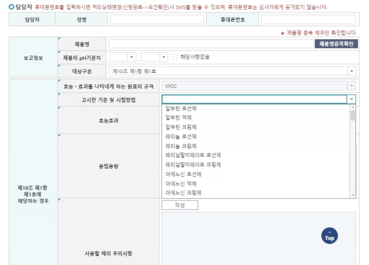 - 미백, 주름 개선 기능의 경우 식약처 고시 기준에 따라 작성해야 하며, 효능과 안전성에 대한 근거를 명확히 기재해야 합니다.