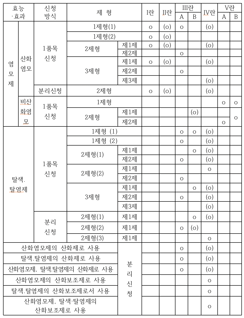 ※ 다만, 2제형 산화염모제에서 제2제의 유효성분인 ⅢA란의 성분이 제1제에 배합되고 제2제가 희석제 등으로 구성되어 유효성분을 포함하지 않는 경우에도 제2제를 1개 품목으로 신청할 수 있다.
