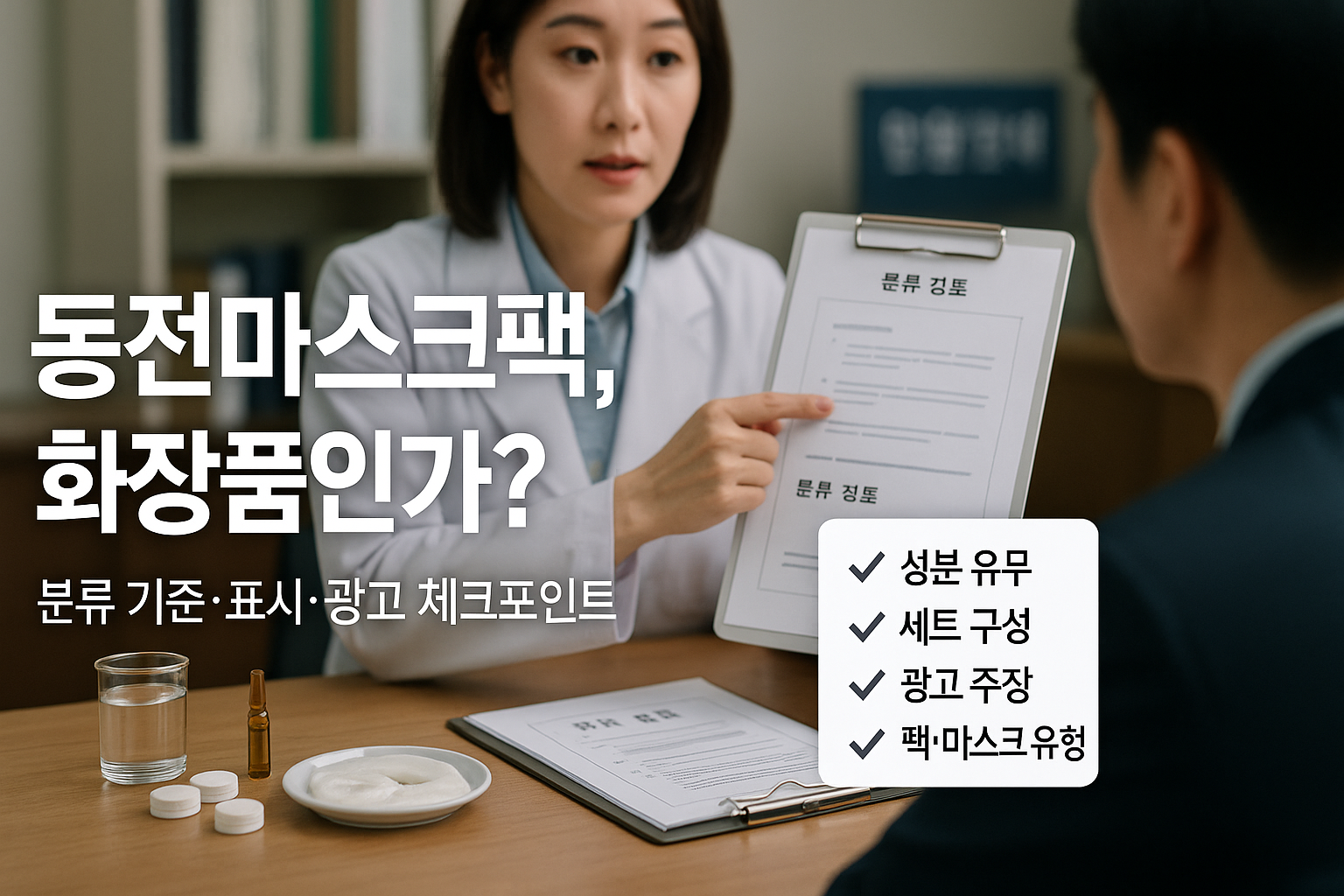 압축·건조된 시트지를 물에 적셔 쓰는 이른바 동전마스크팩이 언제 화장품이 되고, 언제 아닌지는 제품 구성과 표시·광고, 성분 유무에 따라 달라집니다. 핵심은 피부에 사용하는 ‘물품’로서 화장품 정의에 부합하느냐와 효능·효과 주장의 수준입니다.