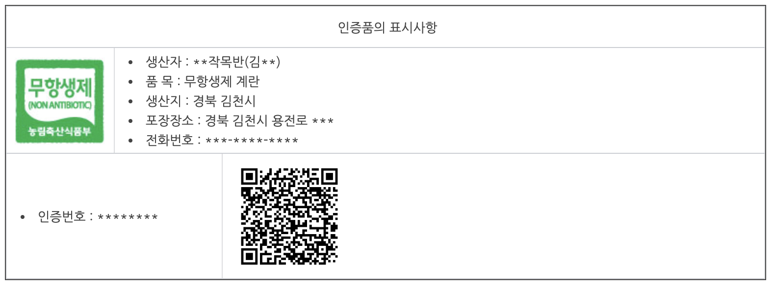 - 인증사업자의 성명 또는 업체명: 인증서에 기재된 명칭대로 표시하며, 단체명 뒤에 개별 생산자명을 괄호로 추가할 수 있습니다.