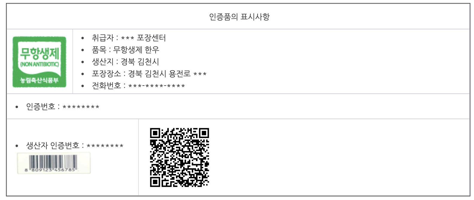 - 인증사업자의 성명 또는 업체명: 인증서에 기재된 명칭대로 표시하며, 단체명 뒤에 개별 생산자명을 괄호로 추가할 수 있습니다.