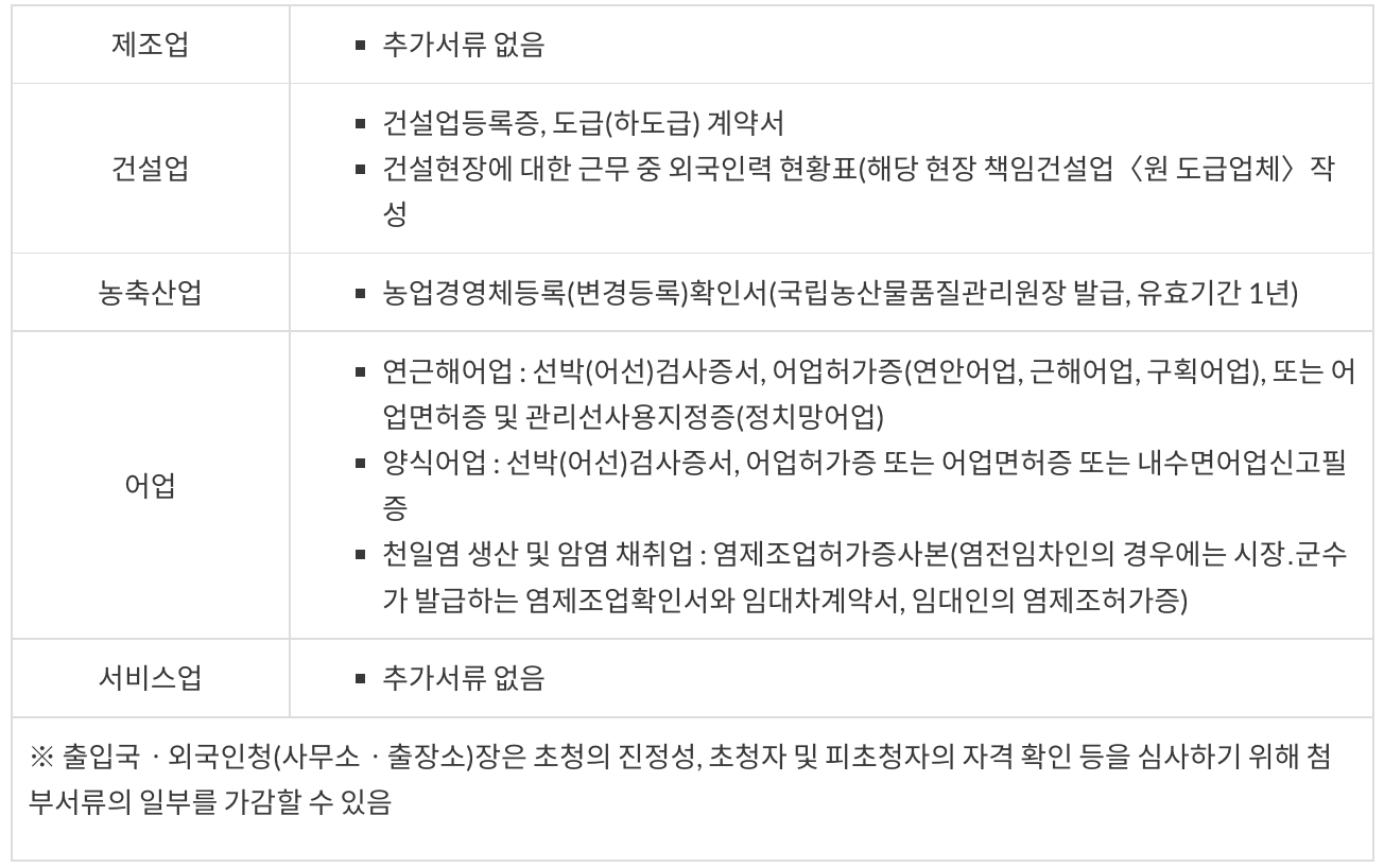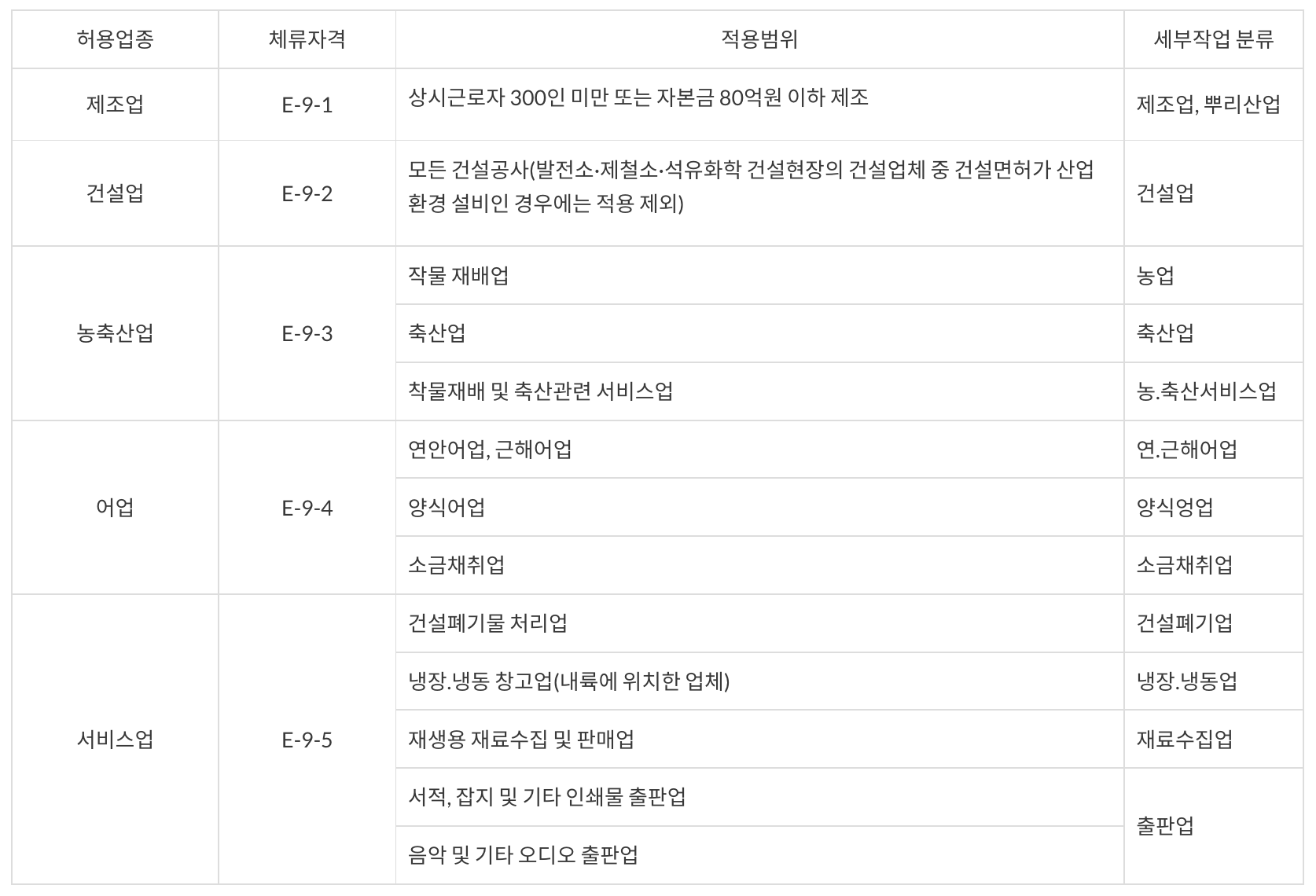 - 허용인원: 업종별·사업장별 고용허용 기준에 의함