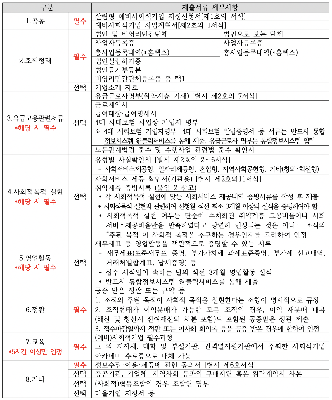 - 한국임업진흥원, 한국사회적기업진흥원, 권역별지원기관, 지방자치단체, 대학 및 대학 부설기관에서 주최한 사회적기업 아카데미의 수료증으로 대체 가능