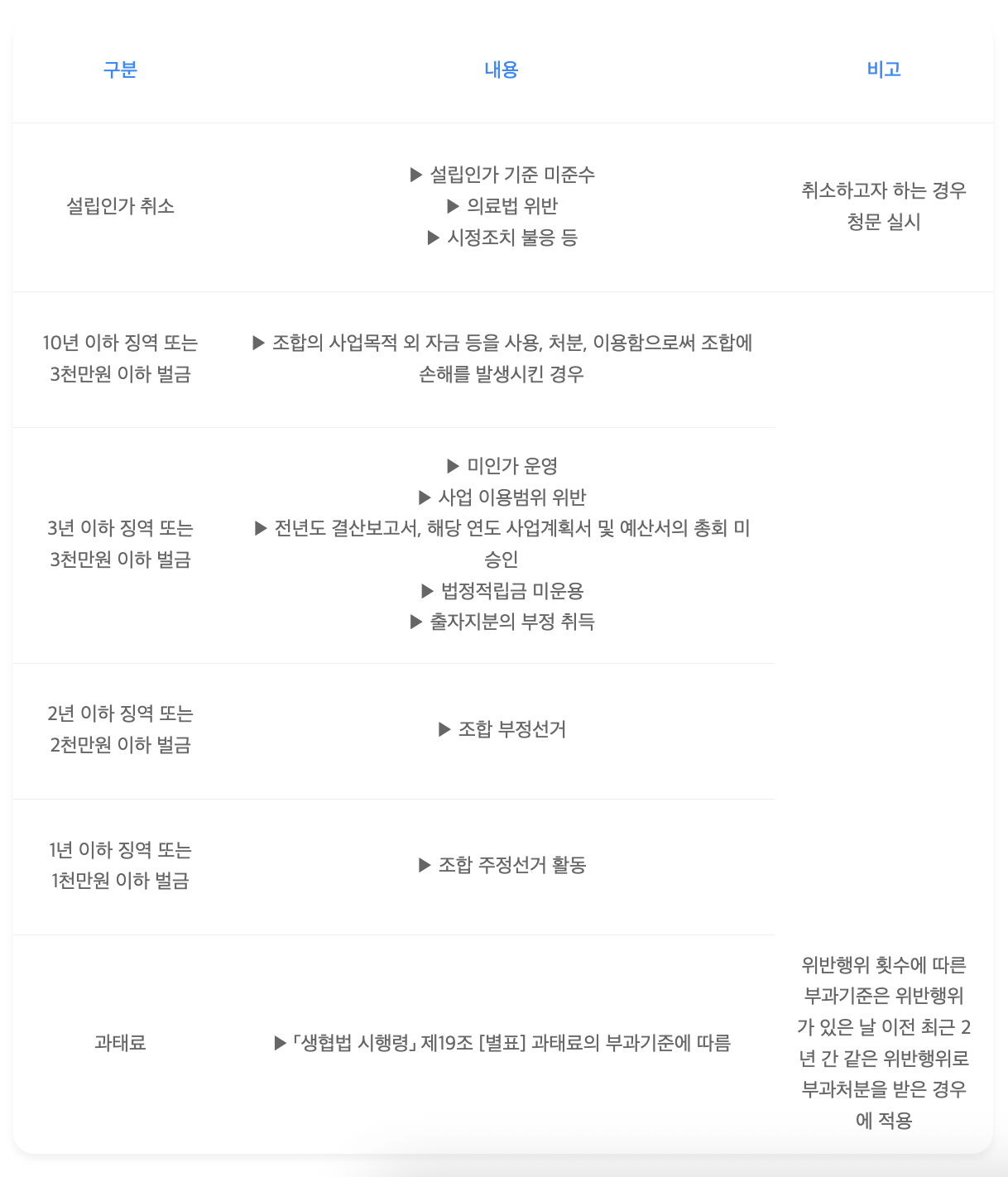 관련 법령: 「생협법」 제46조의2, 「생협법 시행령」 제10조의2, 제10조의3