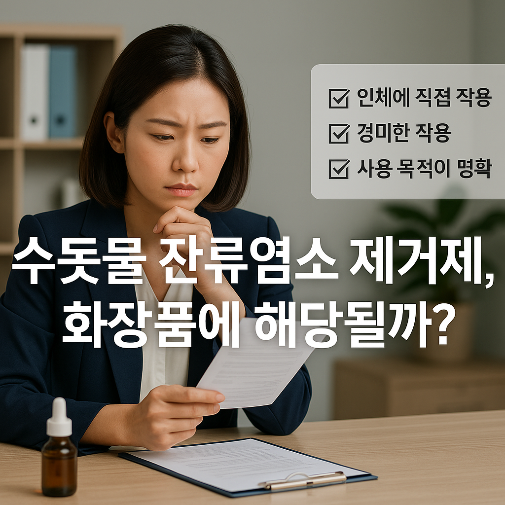 수돗물 잔류염소 제거제는 간접적으로 피부 자극을 줄여줄 수는 있지만, 그 작용 대상이 인체가 아닌 수돗물이므로 화장품 대상에서 명확히 제외된다는 점을 실무에서 반드시 인지해 두시는 것이 중요합니다.