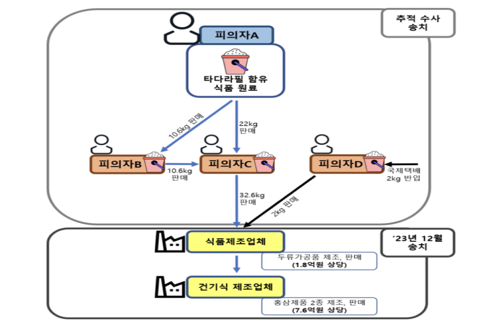 식약처는 이미 2023년 12월, C씨와 D씨로부터 불법 원료를 공급받아 '발아대두단백'을 제조하고 판매한 식품제조업체와, 이 '발아대두단백'을 사용하여 타다라필이 함유된 홍삼 건강기능식품 2종(총 7억 6천만원 상당)을 제조하여 다단계 방식으로 판매한 건강기능식품제조업체 등 관련자들을 「식품위생법」 및 「건강기능식품에 관한 법률」 위반 혐의로 검찰에 송치한 바 있습니다. 이번 수사는 당시 원료를 공급한 상선에 대한 추적 수사 결과입니다.