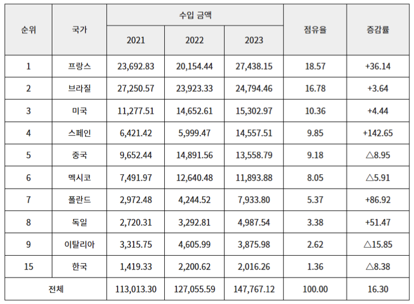 2023년 아르헨티나의 화장품 총 수입액은 약 1억 4,776만 달러로, 전년 대비 16.3% 증가하며 견조한 성장세를 이어갔습니다. 주요 수입국은 프랑스, 브라질, 미국으로, 이들 3개국이 전체 수입 시장의 약 45.7%를 차지하고 있습니다. 다국적 뷰티 기업들의 영향력이 강하게 나타나는 시장입니다.