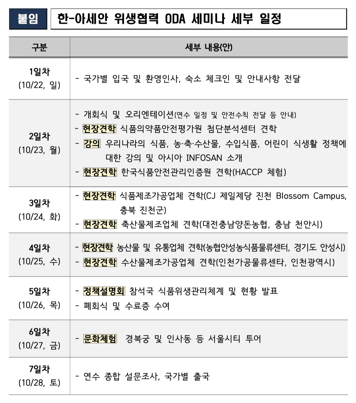 📜 이번 연수는 위생분야 ODA*의 일환으로 마련. 국내 농·축·수산물의 수출 촉진 및 안전한 수입식품 소비 환경 조성을 위함이다.