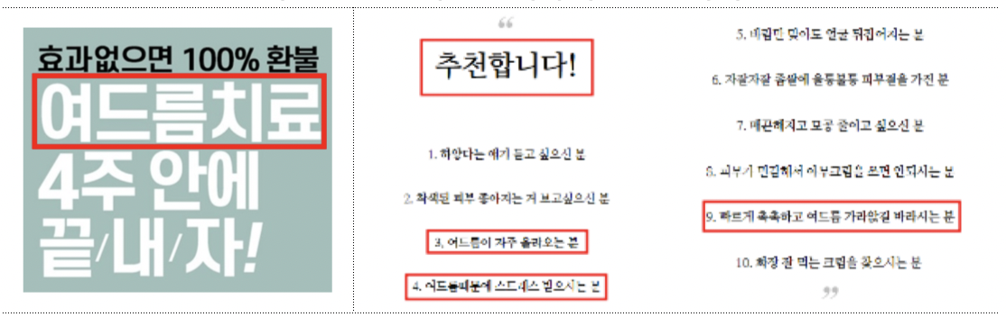 ‘4주 안에 끝내자’, ‘여드름 치료 보장’, ‘효과 없으면 환불’ 등 강력한 표현은 소비자에게 오해를 줄 수 있습니다. 식약처는 여드름성 피부 완화 기능성화장품의 경우, 객관적인 시험자료가 있는 경우에만 ‘여드름성 피부에 적합’이라는 수준으로 광고가 가능하다고 밝혔습니다.