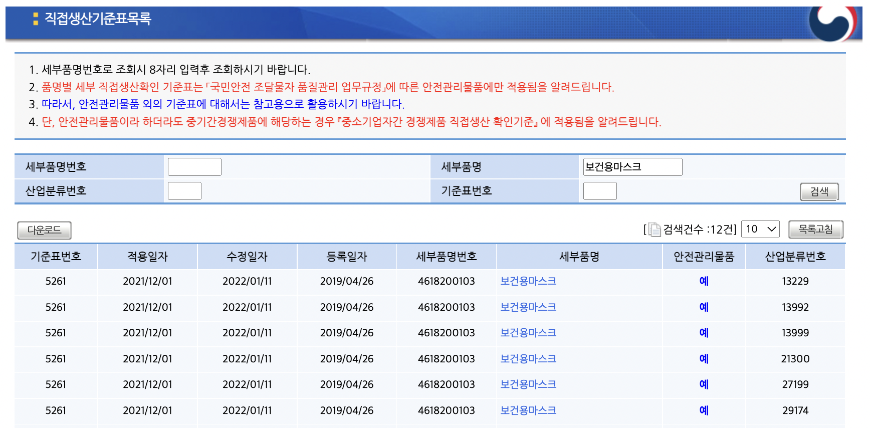 의약외품 마스크를 제조하시는 업체에서 정부조달 등을 위해 직접생산확을 진행하기 위해서는 보건용 마스크의 "산업분류번호"(산업분류 코드)를 알아야 합니다. 조달청 직접생산기준표 목록에서 세부품명을 "보건용마스크"로 조회하면 위와같이 6개의 코드를 확인할 수 있습니다.