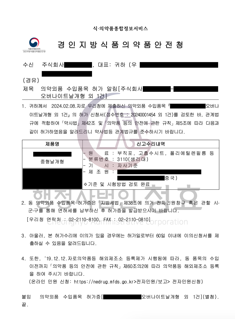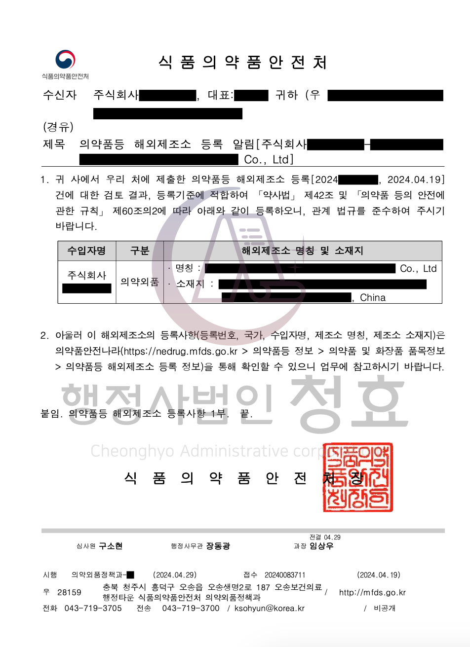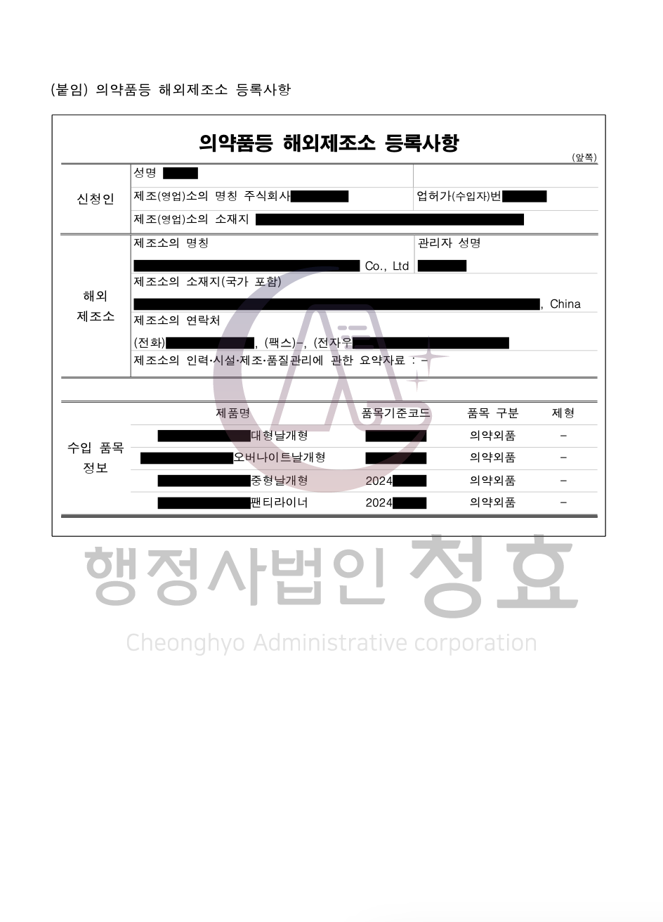 수입의 경우 최초 수입업 신고의 경우 품목 신고(허가)와 동시에 진행되어야 합니다. 수입업 신고 및 품목 신고(허가) 후 해외 조조소로부터 제품을 수입.통관하기 위해서는 해외제조소 등록하여야 합니다. 행정사법인 청효에서는 수입업 신고, 품목 신고(허가), 해외제조소 등록까지 다이렉트로 처리하고 있습니다.