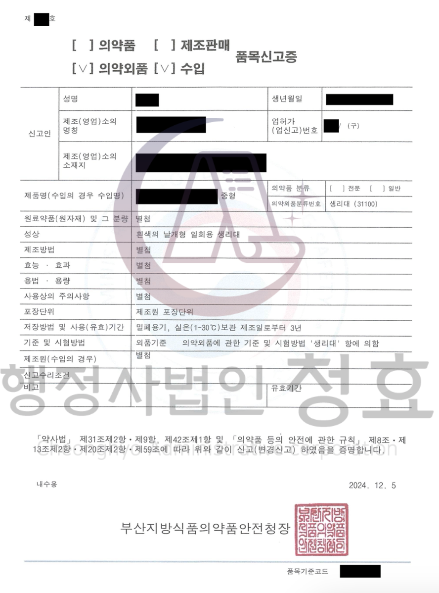 의약외품 생리대 수입업 수임.처리 사례 및 절차 안내(제조 포함) (1) | 2024.05.01 |