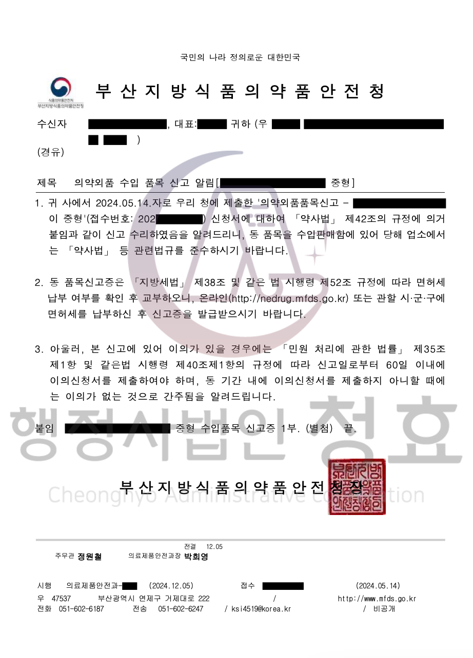 - 국내 시험 완료: 수입된 제품 샘플을 국내 시험기관에 제출해 안전성 및 품질 검사를 완료.
