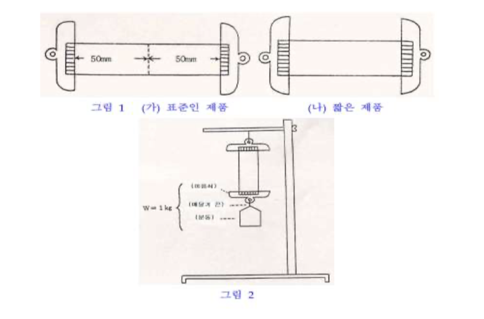 이 시험은 생리대의 최소 강도를 확인하기 위한 것입니다. 섬유가 많이 흩어지거나 제품 구조에 결함이 있는 경우, 이 시험에서 부적합으로 판정될 수 있습니다. 생리대의 채취 방법은 흡수량 시험과 같지만, 탈지면, 레이스테이플면, 흡수지 등 단독재료의 제품에 대해서는 섬유의 방향이나 얽힌 상태를 보고, 인장 강도가 큰 방향으로 하중을 가해 생리대를 만듭니다. 시험에서는 금속 집게를 끼우는 방법(그림 1) 및 하중을 가하는 방법(그림 2)을 사용합니다.