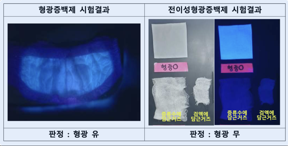 형광증백제 시험결과를 확인할 수 있는 시험성적서와 시험 기초자료를 제출합니다. 형광증백제 시험은 사용면이 인체와 접촉하는 부분이 위로 오도록 검체를 놓고, 형광이 나타나는지 확인합니다. 생리대의 경우, 사용면이 보이도록 뒤집거나 펼쳐서 측정하며, 제품이 큰 경우 전면부와 후면부를 모두 측정해서 결과사진을 제출합니다. 형광이 관찰되는 경우, '의약외품에 관한 기준 및 시험방법 KQC 식약처 고시'의 생리대에 대한 전이성형광증백제 시험을 수행하고 그 결과 사진을 제출합니다.