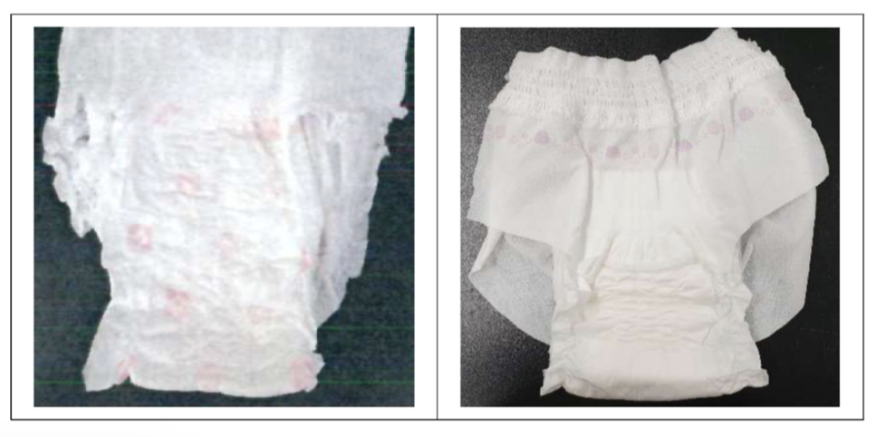 예시 2) OO색 무늬가 있는 겉면에 탄력성이 있는 옆면과 허리밴드가 있고, 흡수부위가 미백색인 팬티형 일회용 생리대