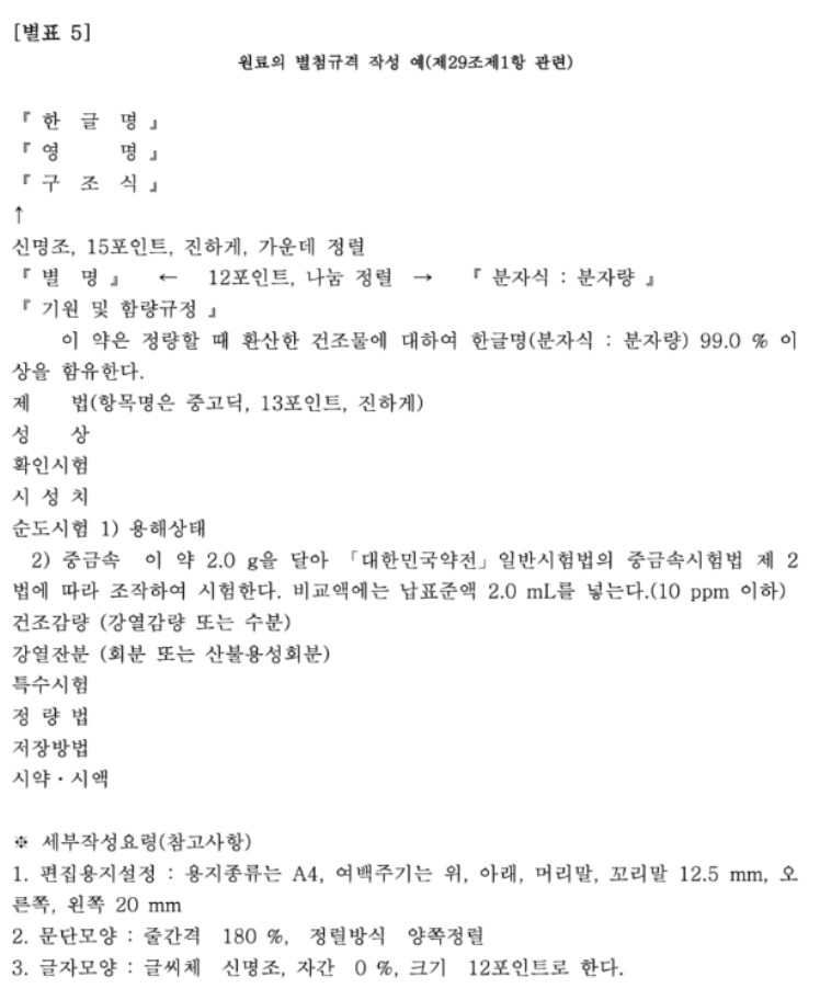- 대한민국약전 등 공정서 기준을 따르는 것이 권장됩니다.