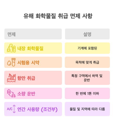 다행히 모든 경우에 허가가 필요한 것은 아닙니다. 화학물질관리법 및 관련 규정에서는 특정 조건을 만족하는 경우 영업허가를 면제해주고 있습니다. 주요 면제 조건은 다음과 같습니다.