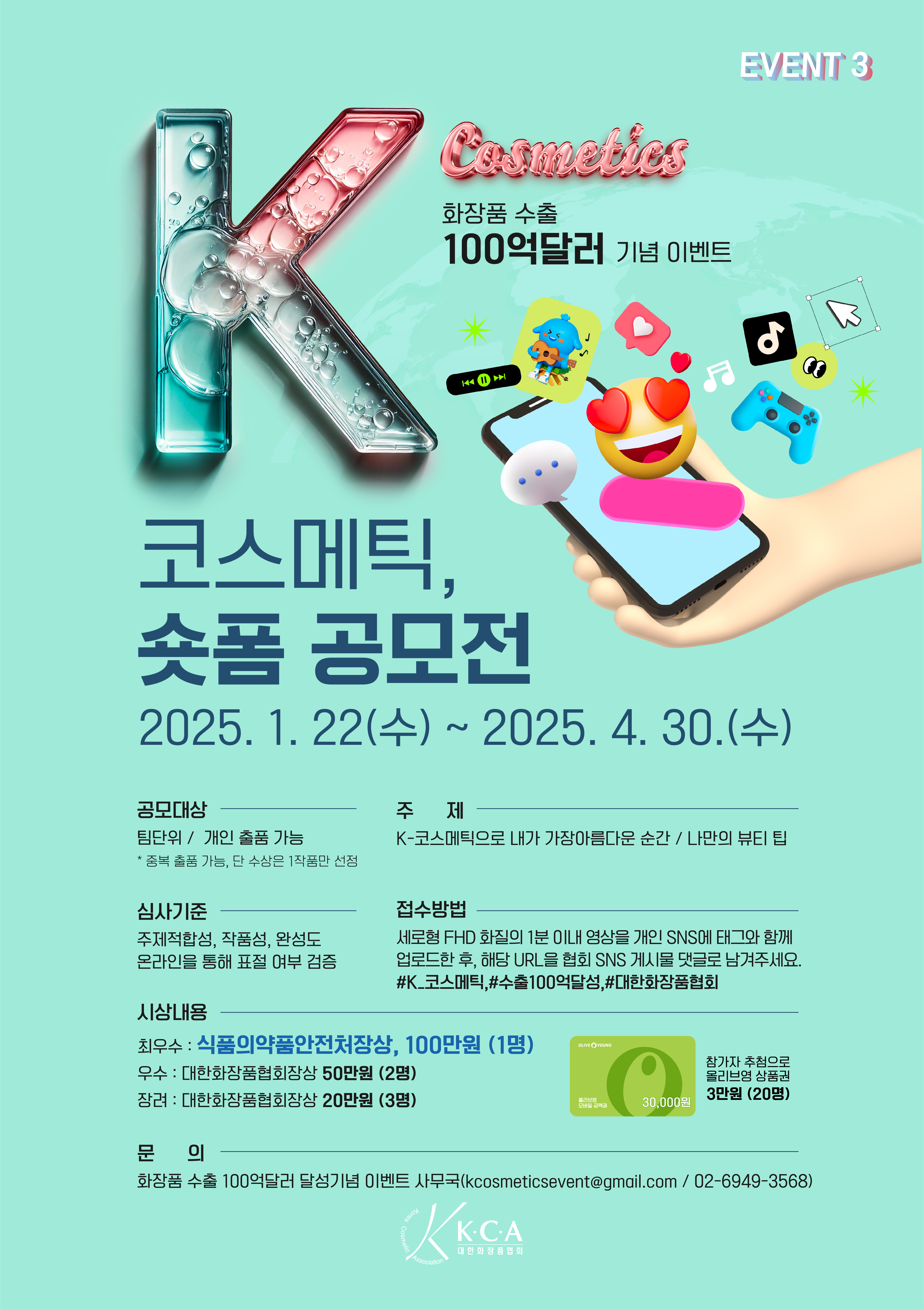 대한화장품협회는 2025년, 한국 화장품 수출이 100억 달러라는 의미 있는 성과를 기념하며 화장품 업계 관계자 및 소비자들과 함께 축하의 장을 마련하였습니다. 이번 기념 행사는 업계의 성과를 되새기고 K-뷰티의 글로벌 도약을 다짐하는 자리로, 누구나 즐길 수 있는 다양한 이벤트가 준비되어 있습니다.