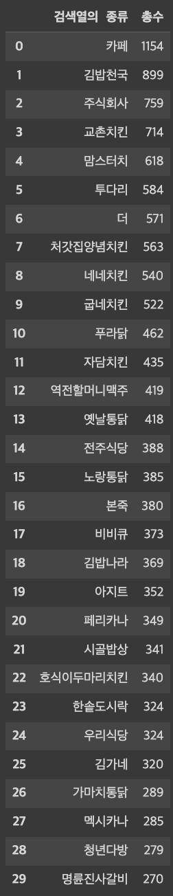 수정된 사업장명을 가지고 상위 30위까지 뽑아봤습니다. 앞글자만 따다보니 '카페', '더'와 같이 상호와 무관한 단어가 랭크에 올라갔네요. 그것을 제외하고 보면 역시 프랜차이즈가 압도적이네요. '역전할머니맥주'라는 상호는 생소한데 상위에 랭크되어 있어서 검색해 봤더니 이것도 프랜차이즈네요. 인기가 많은가 봅니다.