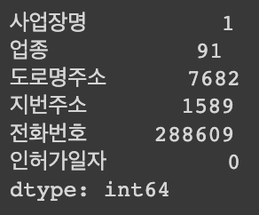 Index(['번호', '개방서비스명', '개방서비스아이디', '개방자치단체코드', '관리번호', '인허가일자', '인허가취소일자',