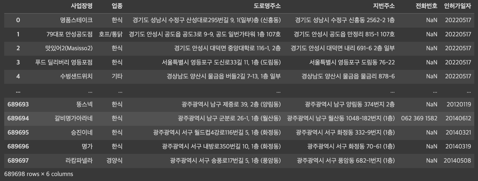 앞에서 전국 일반음식점 데이터 2,012,833건을 불러와서 2022년 7월 31일 현재 폐업한 1,323,135개 업체 정보를 제외하고, 영업 중인 689,698개의 일반음식점을 df 데이터프레임으로 불러왔습니다.