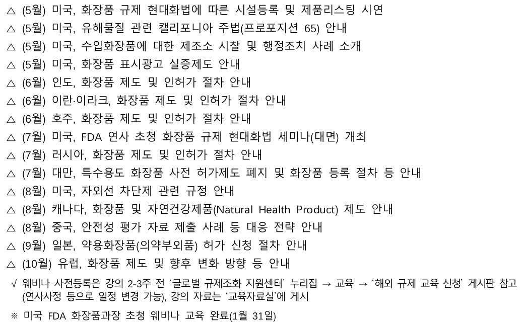 - 해외 규제정보 웨비나: 중국, 미국 등 주요 수출국의 화장품 규제 정보 제공.