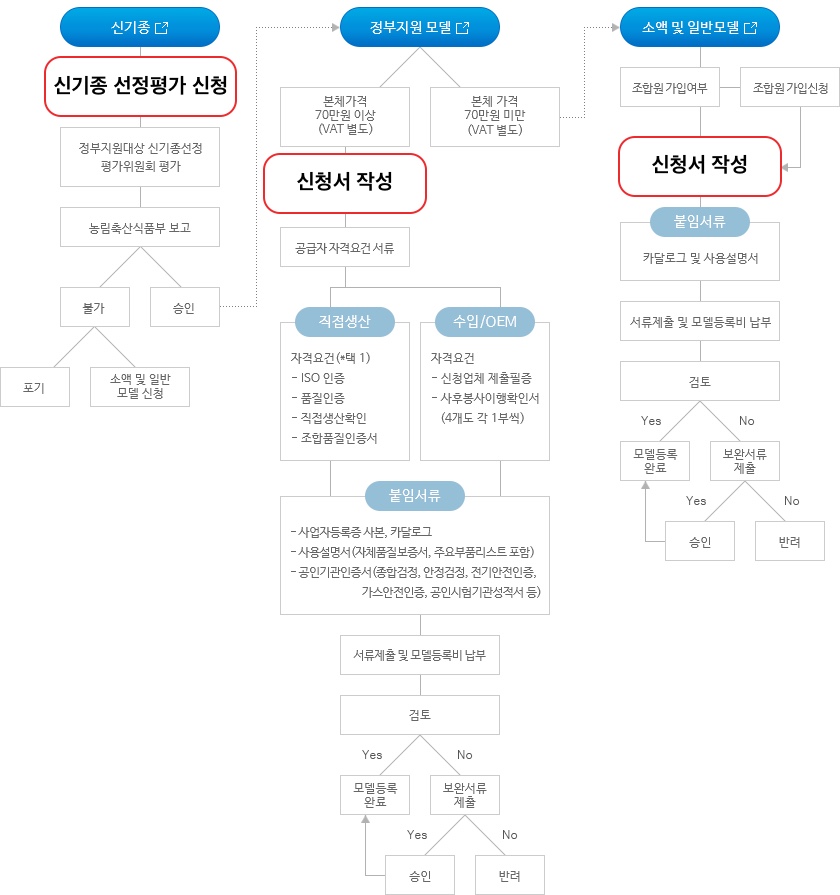 이미 시장에서 생산되어 유통되고 있는 농업기계의 경우에는 요건을 갖추어 정부지원 모델로 등록을 하면 해당 농업기계를 필요로 하는 농업인 정책자금을 활용하여 구매 부담을 줄여 활용이 가능합니다. 이때 동일한 기능과 구조를 가진 농업기계라 하더라도 성능 및 요건을 충족한다면 새로운 제조소의 제품으로 등록이 가능합니다. 그러나 기존에 없던 새로운 농업기계일 경우 신기종 등록을 우선 진행하여야 합니다. 아래의 전제 절차를 참조하세요.
