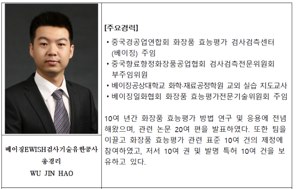 이번 웨비나의 가장 큰 강점은 세 명의 강연자가 각자의 전문 분야에서 10년 이상의 실무 경험과 학술적 권위를 겸비하고 있다는 점입니다. WU JIN HAO 총경리는 화장품 효능평가 관련 표준 10여 건의 제정에 참여했으며, 저서 10여 권 및 발명 특허 10여 건을 보유하고 있습니다. 중국 화장품 효능평가 분야에서 그의 영향력은 실로 막강합니다.