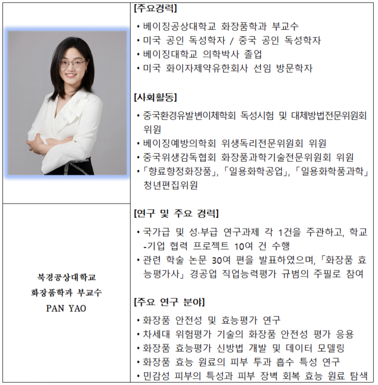 PAN YAO 부교수는 미국과 중국 양국의 공인 독성학자 자격을 보유하고 있으며, 국가급 및 성·부급 연구과제를 주관하고 학교-기업 협력 프로젝트 10여 건을 수행한 경험이 있습니다. 그의 강연은 학문적 깊이와 실무적 적용 가능성을 동시에 갖추고 있어, 안전성 평가의 복잡한 개념을 명확하게 이해할 수 있도록 돕습니다.