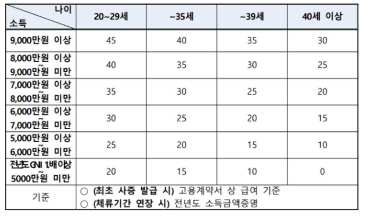 - 연봉: GNI의 1배 이상이며 연봉 범위에 따라 점수가 다릅니다.