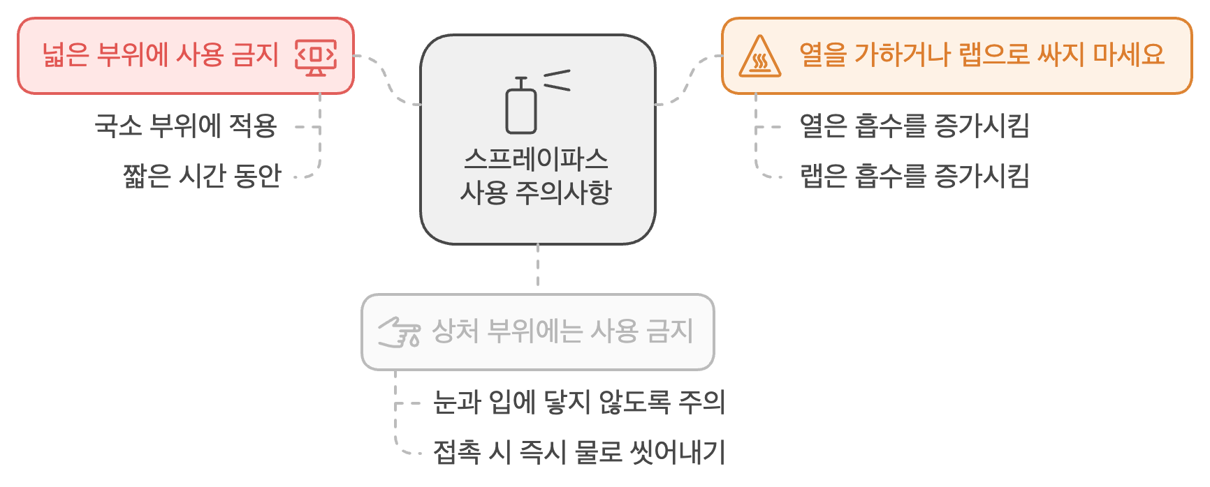 - 열을 가하거나 랩으로 싸지 마세요: 스프레이파스를 바른 부위에 열을 가하거나 랩으로 감싸는 것은 피해야 합니다. 이렇게 하면 피부를 통해 약물이 더 많이 흡수될 수 있어 부작용 위험이 커집니다.