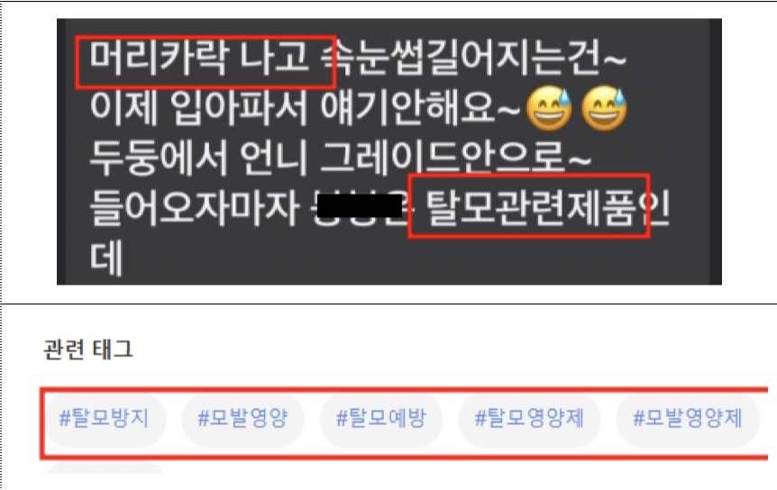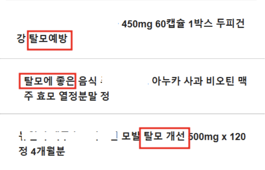 일부 광고(0.5%)는 '먹는 탈모약'과 같은 표현을 사용하여 해당 제품이 의약품인 것처럼 소비자를 혼동하게 만들었습니다. 탈모 치료는 의사의 진단과 처방에 따라 의약품으로 이루어져야 하며, 식품이나 건강기능식품으로 대체할 수 없습니다.