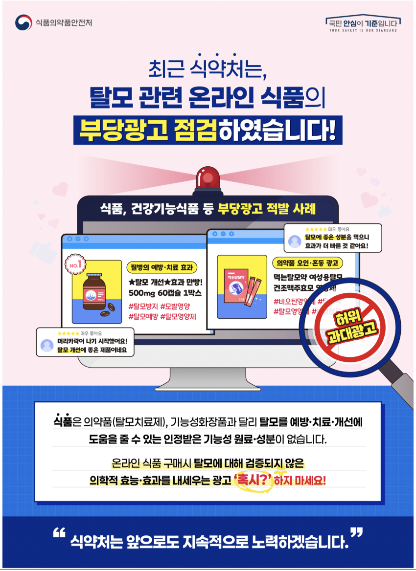 온라인에서 식품이나 건강기능식품을 구매할 때는 '탈모 예방', '발모 촉진' 등 검증되지 않은 의학적 효능·효과를 내세우는 광고에 주의해야 합니다. 특히 '후기' 형식으로 실제 효과가 있는 것처럼 꾸며진 광고에 현혹되지 않도록 각별한 주의가 필요합니다.