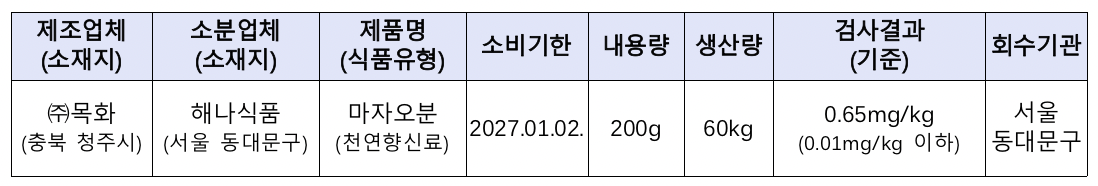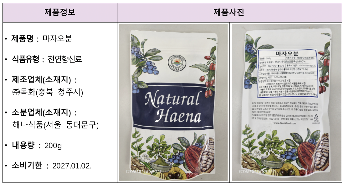만약 소비기한이 '2027.01.02.'로 표시된 (주)목화 제조, 해나식품 소분·판매 '마자오분' 200g 제품을 구매하셨거나 보유하고 계신 경우, 즉시 섭취를 중단해주시기 바랍니다.
