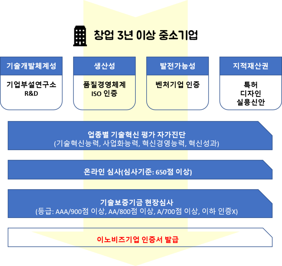 이노비즈 인증을 받기위한 신청자격으로, 「중소기업기본법」상의 중소기업으로서 신청일 현재 설립 후 3년 이상인 기업이며, 정상 운영 중인 기업이라면 신청이 가능합니다. 업종에는 제한이 없습니다.