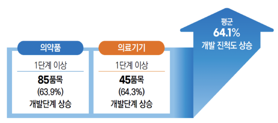 - 개발 단계 상승: 전체의 약 64%(의약품 85건, 의료기기 45건)에서 비임상 → 임상 등 상위 단계로 진입