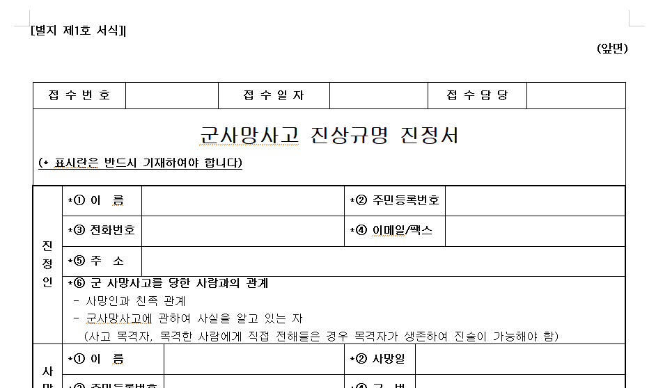 사고관계자가 재조사를 위한 진정을 원하는 경우, "군사망사고 진상규명 진정서"를 작성하여 '대통령소속 군사망사고 진상규명 위원회'로 우편, 방문, FAX, 이메일 등으로 제출하면 됩니다.