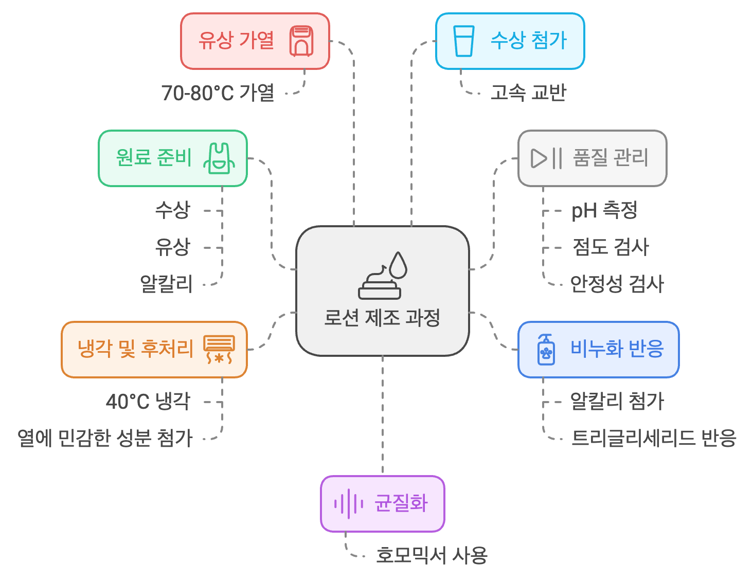 이 과정에서 생긴 지방산 나트륨은 로션 제조 과정에서 중요한 유화제로 작용하여 오일과 물을 결합시킵니다. 비누화 반응을 통해 생성된 유화제는 로션의 안정성을 높이고, 제품의 질감에도 큰 영향을 줍니다.