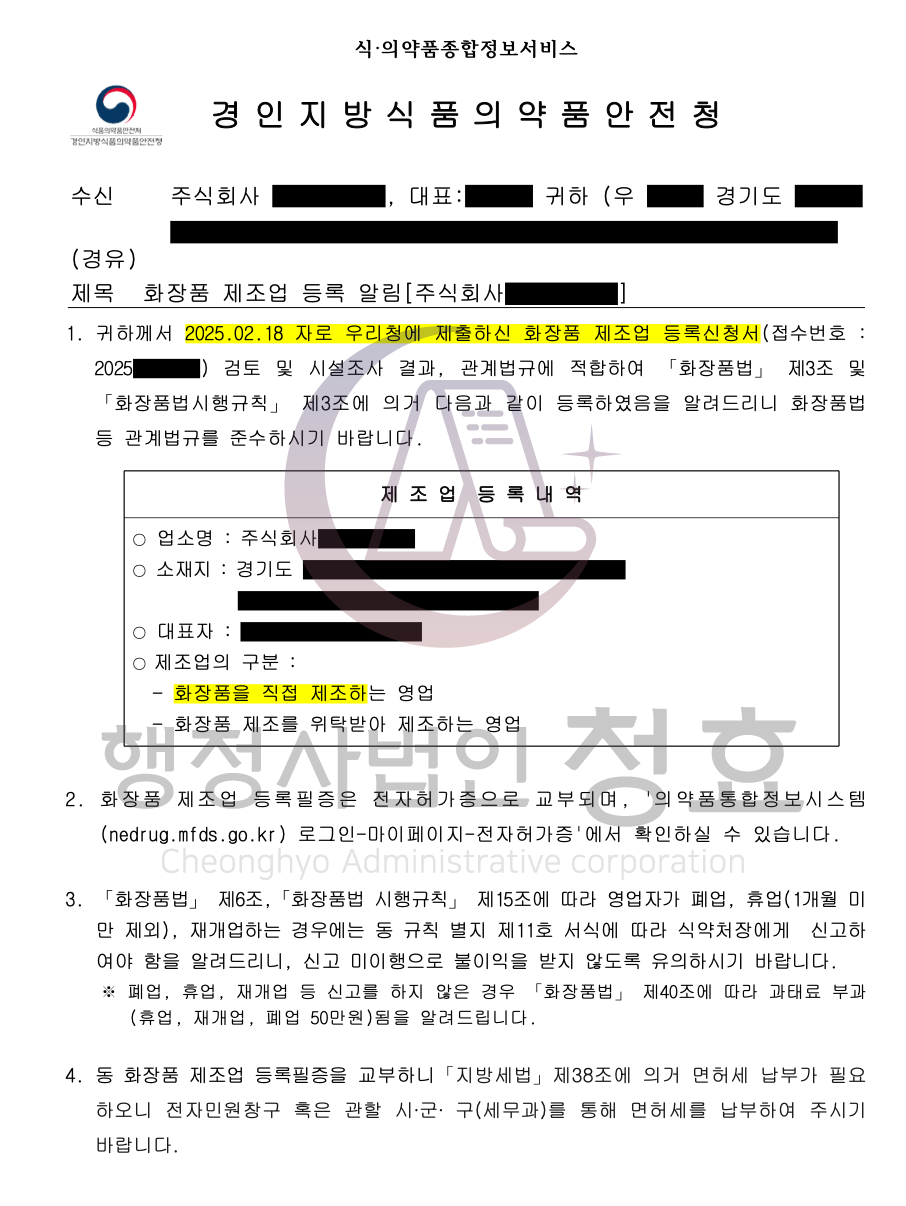 - 제조시설 기준을 충족한 것으로 판단되면 등록 완료 및 영업 개시 가능