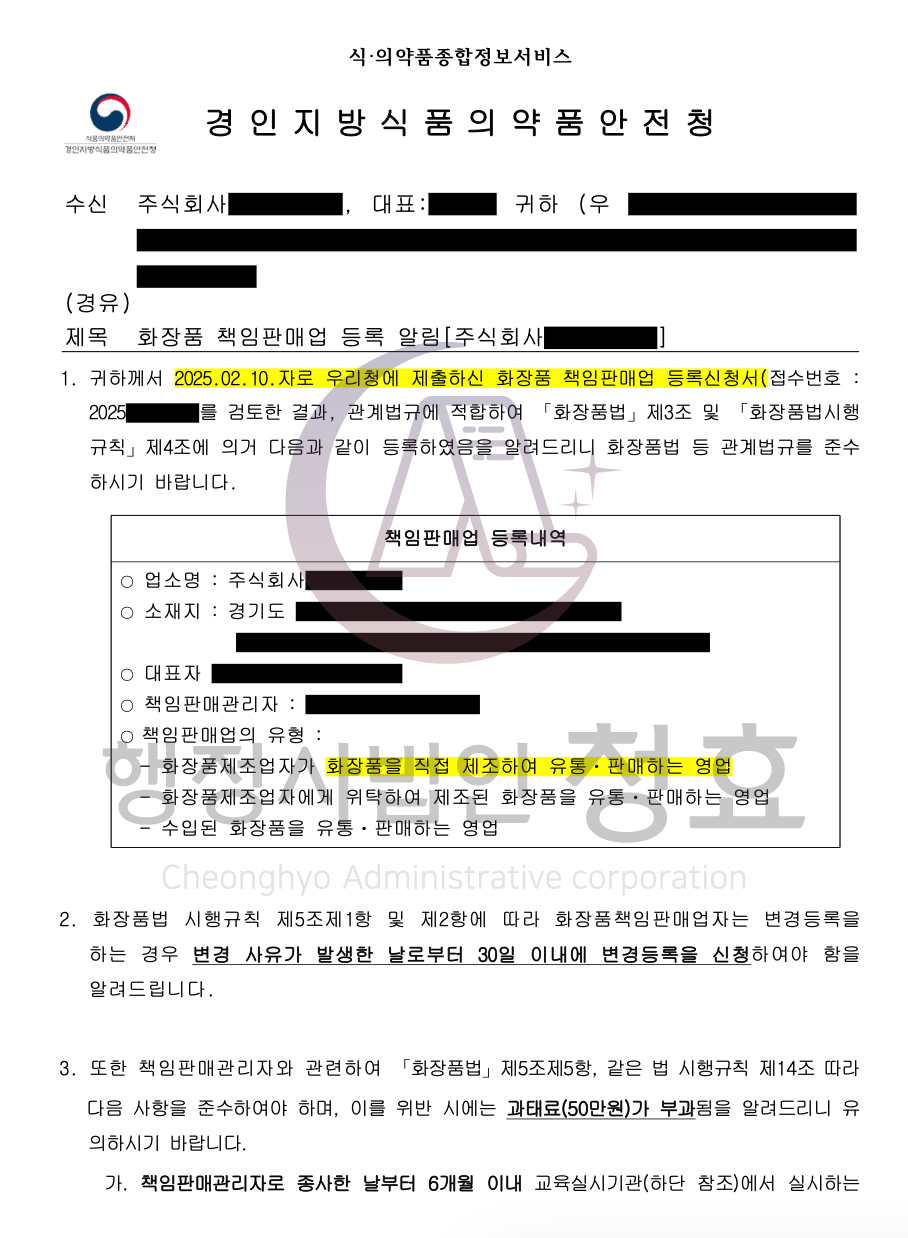 등록 이후에도 사업자는 지속적으로 식약청의 관리감독 대상이 됩니다. 화장품법에서 정한 제조·판매 기준 준수 여부에 대한 정기적인 관리감독이 이루어지므로, 등록 이후에도 전문가의 자문을 통해 준법 경영을 지속하는 것이 중요합니다.