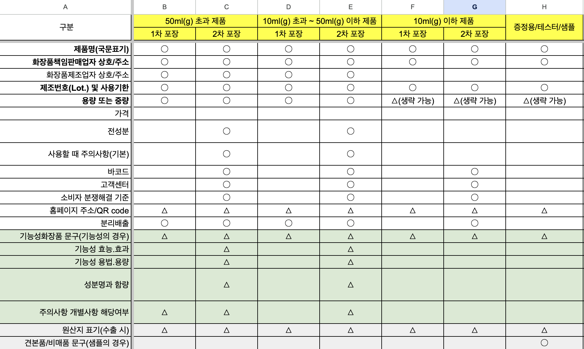 화장품 기재 및 표시사항 정리표