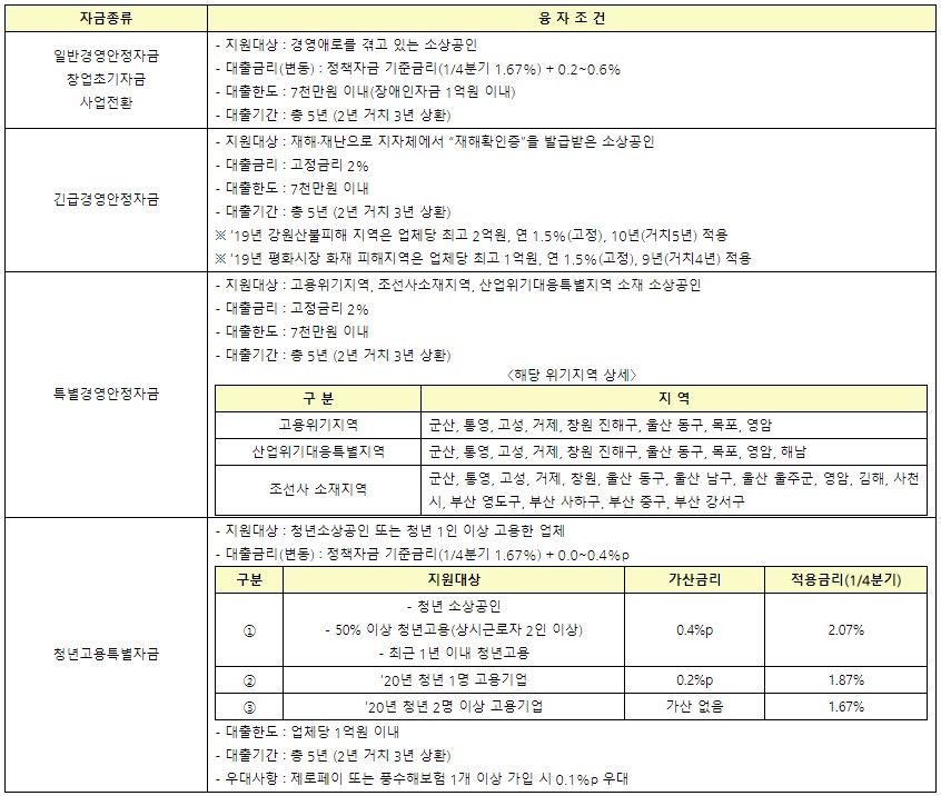 소공인특화자금, 성장촉진자금(자동화), 신사업창업사관학교 연계자금, 생활혁신형창업지원 연계자금(성공불융자), 사회적경제기업 전용자금